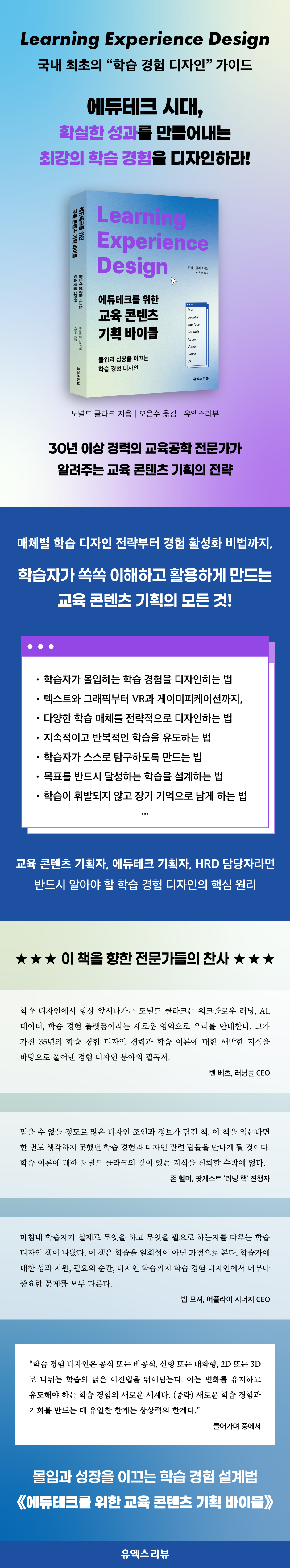 학습은 일회성의 이벤트가 아니라, 상호작용의 과정이다. 단순히 새로운 매체를 활용해 엔터테인먼트 경험을 제공하는 것만으로 효과적인 학습을 이끌 수 있다는 생각은 착각이다. 《에듀테크를 위한 교육 콘텐츠 기획 바이블》은 이러한 학습의 특성에 주목해 학습 내용이 학습자의 장기 기억에 각인되어 실생활에서 분명하게 활용되는 것에 목표를 두는 ‘학습 경험 디자인’을 중점적으로 다룬다. 학습은 이제 다양한 매체를 통해 언제 어디서든 이루어진다. 학습자가 몰입하는 학습 경험을 디자인하는 법, 다양한 학습 매체를 전략적으로 디자인하는 법, 목표를 반드시 달성하는 학습을 설계하는 법 등 매체별 학습 경험 전달에 관한 폭넓은 탐구와 검증된 학습 이론을 기반으로 실용적 방법을 제시하는 국내 최초의 “학습 경험 디자인” 교과서라 할 수 있다. 에듀테크 개발자, 교육 콘텐츠 기획자, 직무 교육 관계자들은 30년이 넘는 경력의 교육공학 전문가인 저자의 조언을 통해 학습자를 몰입시키고 성과를 내는 최고의 교육 콘텐츠를 만들어낼 수 있을 것이다.