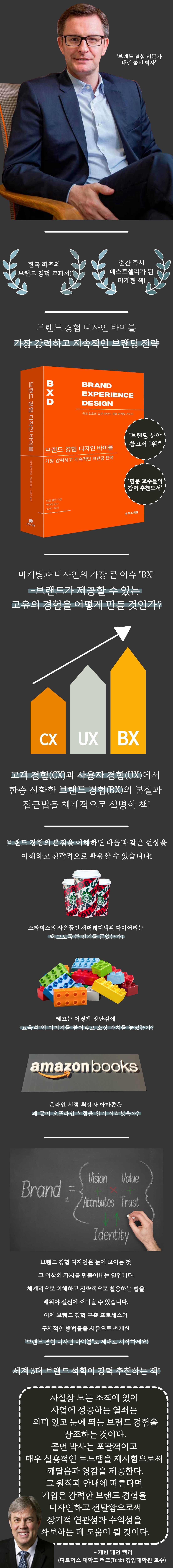 『브랜드 경험 디자인 바이블』은 기억에 남는 브랜드 경험을 구축하여 강력한 브랜드를 만들고 브랜드의 일관성을 확장하는 데 유용한 지침이 되는 실전 참고서이다. 브랜드 경험 디자인은 차별화된 브랜드를 만들고 브랜드의 연관성을 지키면서 지속적으로 사업을 확장할 수 있는 방법이다. 이 책은 마케팅과 디자인 모두에서 화두가 되는 브랜드 경험 디자인을 국내 최초로 정리했다. 영국 최고 수준의 브랜드 경험 컨설팅 기업 대표이자 브랜드 경험의 권위자 대런 콜먼 박사의 풍부한 실무 경험과 연구를 바탕으로 한다. 브랜드 경험 청사진을 비롯한 다양한 툴을 중심으로 실용성 있게 조직한 이 책은 효과적인 브랜드 경험을 구축하는 과정을 단계별로 안내한다. 또 전문가의 통찰과 실제 사례를 이해하기 쉽게 이야기식으로 결합하여 설명한다.