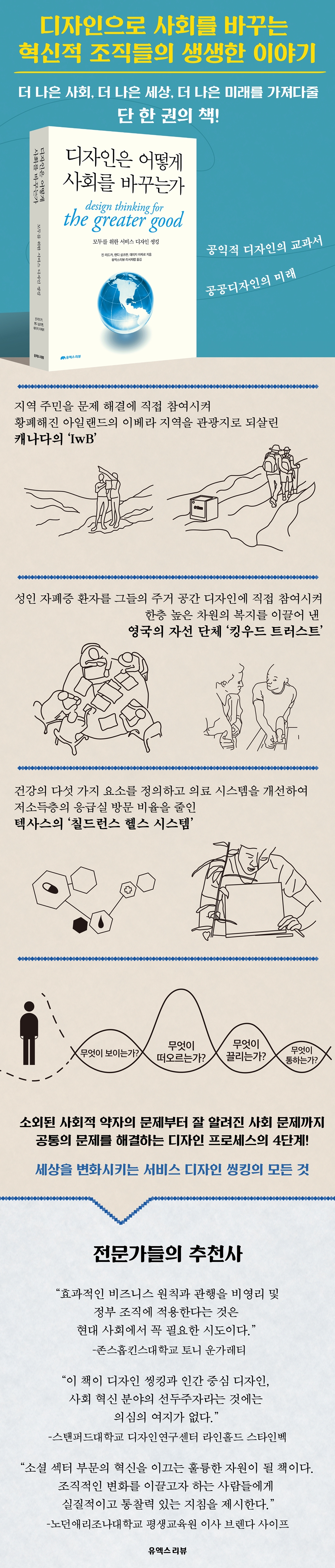 모두가 행복한 사회를 만드는 데 있어 디자인은 어떤 도움이 될까? 사람 중심의 제품과 서비스를 제공하는 기업 문화를 전파한 디자인의 역할은 더 이상 비즈니스에만 국한되지 않는다. 복지의 사각지대에 놓인 소외 계층부터 사회자원의 낭비까지 크고 작은 공공의 문제들을 디자인으로 해결할 수 있다. 이 책은 사회 혁신과 공익을 위한 디자인을 다루며, 그 전략으로 디자인 씽킹을 제시한다. 디자인 씽킹이 무엇이고 왜 중요한지, 그리고 이것을 어떻게 공익적으로 실행하는지를 누구나 이해하고 활용하기 쉽게 설명하며, 더 나아가 이를 사회 문제 해결에 적용하여 어려움을 해결한 전 세계 공공 조직들의 사례들을 소개한다. 모든 것이 불확실한 현대 사회에서 분명한 사실은, 변화를 두려워하고 현상 유지에만 힘쓰는 조직은 위기를 맞는다는 것이다. 세상을 더 이롭게 만들기 위해 디자인 씽킹이라는 이정표를 갖고 혁신을 시작해 보자.