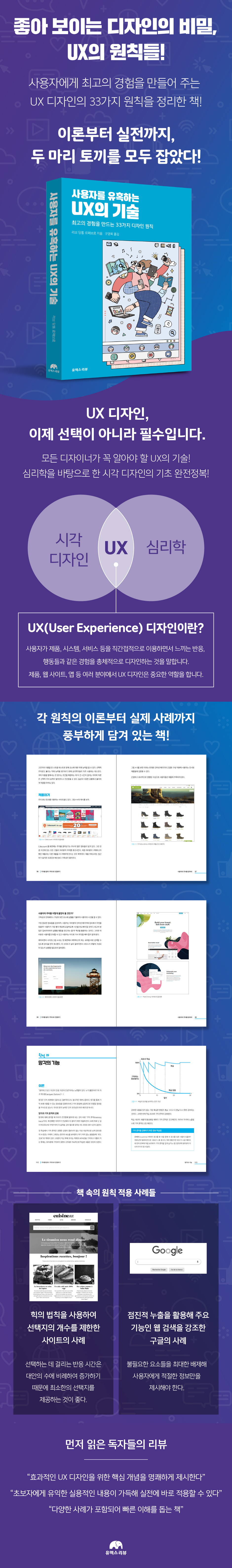 이 책은 좋은 제품, 매력적인 서비스를 만들기 위한 UX 디자인의 기본 원칙을 가르쳐준다. 프랑스의 대표적인 UX 연구자이자 디자인 전략 전문가로 활동하고 있는 리브 당통 르페브르가 최고의 경험을 만드는 33가지 디자인 원칙들을 정리하여 한 권에 담아냈다. 인간의 인지적, 감정적 기능의 본질과 현대의 과학적 연구에 대한 이론 지식을 바탕으로 UX 디자인에 대한 새로운 시각을 제시한다. 더불어 감정, 스토리텔링, 경험에 대한 기억, 멘탈 모델, 설득형 디자인, 참여, 감정 이입 등 UX의 대표적 주제들까지 모두 다룬다. 여기서 제시하는 33개의 원칙은 웹 사이트나 앱 등의 디자인 기획에 곧바로 적용을 할 수 있으므로 유용한 실전 가이드가 되어 줄 것이다. 또한, 이해를 돕기 위한 실제 사례와 저자의 경험담이 곳곳에 녹아들어 흥미를 한층 높였다. 이 책에 호기심을 느끼고 집어 들었다면 UX 디자인과 직접적인 관련이 없는 사람이라 해도 효과적인 디자인에 대해 쉽게 이해할 수 있을 것이며, 상식의 저변을 넓히는 데 도움이 될 것이다. 이 책은 사용자에게 최상의 경험을 제공하고자 하는 UX 디자이너와 기획자에게 효과적인 디자인을 위한 총체적인 사고와 접근 방법을 갖게 해줄 것이고, 창업가와 개발자에게는 UX의 기본 원리와 이론을 쉽게 이해할 기회가 될 것이다.