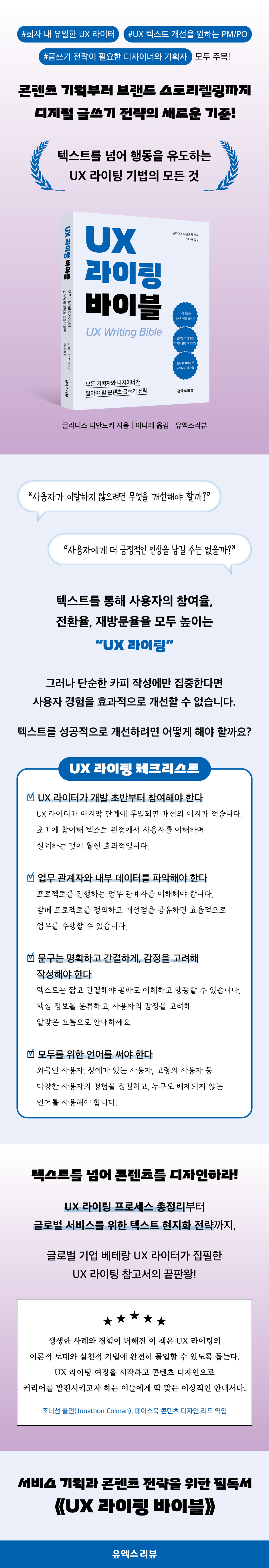 UX 라이터와 UX 라이팅 관점이 필요한 기획자, 디자이너를 위한 『UX 라이팅 바이블』이 출간되었다. UX 라이팅은 텍스트를 통해 사용자 참여, 전환율, 재방문율을 높이는 핵심 전략이다. 브랜드의 보이스부터 리서치, 디자인, 사용성 테스트에 이르기까지 UX 라이팅은 사용자 경험에 새로운 차원을 더한다. 이를 위해 UX 라이터는 사용자를 깊이 있게 탐구해 각 화면과 단계에서 고민 없이 다음 행동을 선택할 수 있도록 안내해야 한다. 이 책은 고객을 자연스럽게 서비스로 유도하는 스토리텔링 기법, 전체 콘텐츠의 톤을 정리하는 콘텐츠 지도 만들기 같은 콘텐츠 기획법뿐 아니라 UX 리서치를 수행하거나 페르소나를 설정할 때 텍스트 작성법과 분석 전략 등 UX 라이팅의 관점에서 디자인 프로세스가 어떻게 운영되어야 하는지 사례와 함께 구체적으로 제시한다. 텍스트와 디자인은 결코 별개일 수 없다. 이 책이 그 경계를 허물고, 두 세계를 자연스럽게 연결하도록 도울 것이다.
