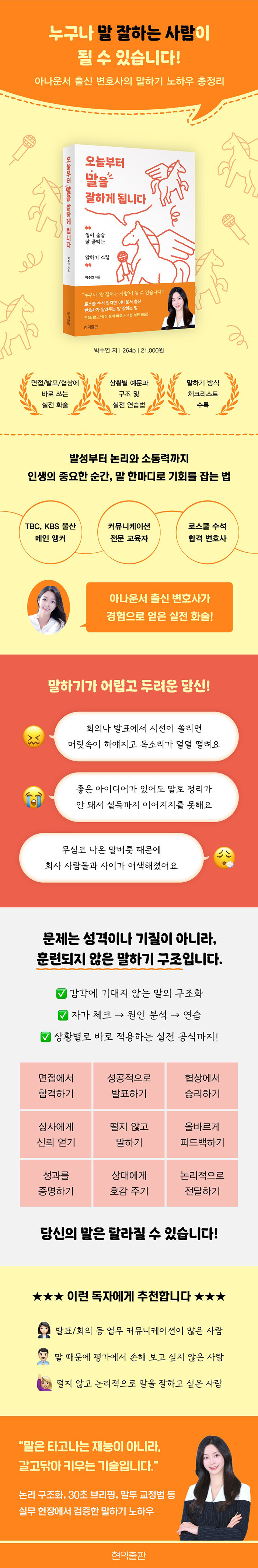 말 잘하는 능력은 타고난 재능이 아니라, 누구나 연습하면 획득할 수 있는 ‘스킬’이다. 저자인 박수연 변호사는 TBC·울산 KBS 아나운서와 대학 교원을 거쳐 로스쿨 수석 합격으로 변호사가 되기까지, 인생의 중요한 순간마다 ‘말’이 기회를 만들어 주었다고 말한다. 면접과 발표, 협상처럼 말 한마디가 결과를 바꾸는 업무 현장에서 말하기 능력은 남다른 경쟁력이 된다. 또한, 유튜브 등 각종 1인 미디어가 활성화되고 누구나 콘텐츠의 생산자가 될 수 있는 지금, 말은 당신에게 날개를 달아 줄 가장 유용한 역량이다.