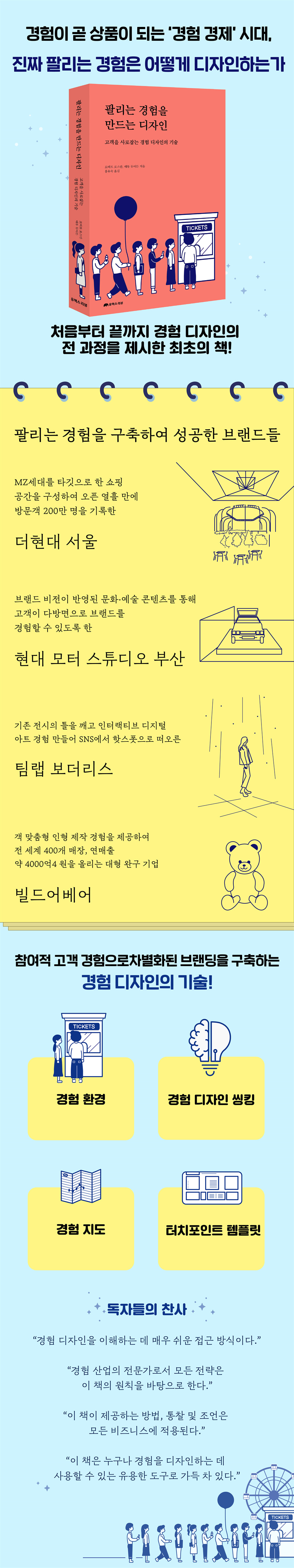 애플, 스타벅스, 디즈니랜드, 에어비앤비 등의 성공 사례를 통해 경험이 브랜드를 차별화하는 강력한 경쟁력이 된다는 사실이 증명되었다. 잘 팔리는 경험은 모두 치밀하게 디자인된 것이다. 기업들은 고객의 경험을 디자인하는 조직을 확대하고 있으며, 비즈니스 모델을 기획하는 사람들과 디자이너들도 경험의 가치를 강조한다. 25년간 경험 디자인을 연구해 온 저자들은 경험이라는 추상적 대상을 구체화하며 디자인하는 과정을 완성하여 소개한다. 비즈니스 기획자와 경험 디자이너가 활용할 수 있는 도구와 템플릿, 사고방식 등을 철저히 실무적 관점에서 제공한다. 현재 가장 영향력 있는 디자인 분야인 UX(사용자 경험) 디자인과 브랜드 경험 디자인을 통합적으로 활용할 수 있는 전략인 경험 디자인의 모든 것을 다룬다.