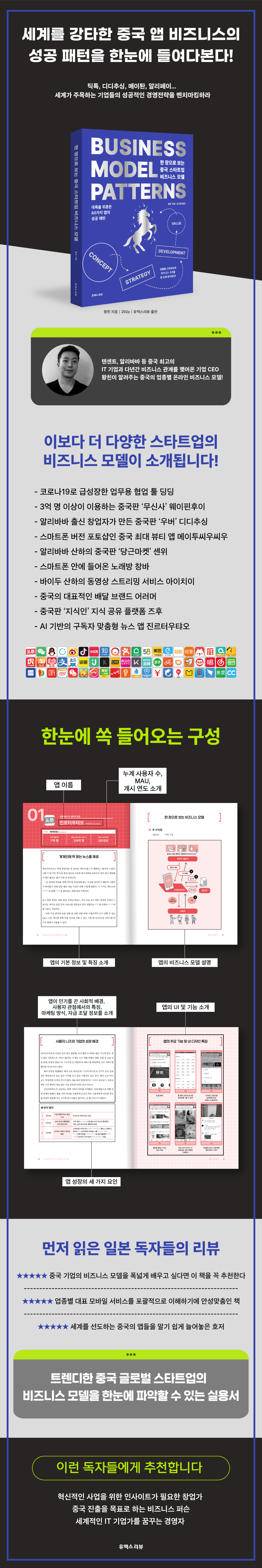 저자는 실리콘밸리가 주목하는 중국 최고의 앱 60가지를 엄선하여 그들의 수익 구조, 성장 배경, 혁신 전략, UI 특징 등을 알기 쉽게 정리한다. 각각의 앱 서비스마다 누계 사용자 수와 월간 사용자 수가 기록되어 있고, 비즈니스 모델 도해가 들어있어 이 책 한 권으로 중국 앱 비즈니스의 전체적인 현황을 망라할 수가 있다. 또한 중국 모바일 비즈니스에 관한 다양한 주제의 칼럼이 수록되어 있어 중국 앱 시장 현황을 더욱 깊게 이해하고자 하는 사람들에게 아주 유용하다. 중국 스타트업에 우리나라의 비즈니스 모델을 그대로 접목하는 것은 무리가 있다. 중국 스타트업의 비즈니스 모델은 중국의 독자적인 문화와 사고방식이 자리 잡고 있기 때문에 그들의 니즈와 경영 방식에 대해 새롭게 이해해야 할 필요가 있는 것이다. 중국 여러 산업의 온라인 비즈니스 모델에 대한 아이디어를 활용해 새로운 비즈니스를 구상하는 창업가와 기획자에게 이 책은 필독서이다. 중국의 문화적인 차이를 이해하면서도 국내 비즈니스에 유용하게 적용될만한 다양한 인사이트를 발견할 수 있을 것이다.