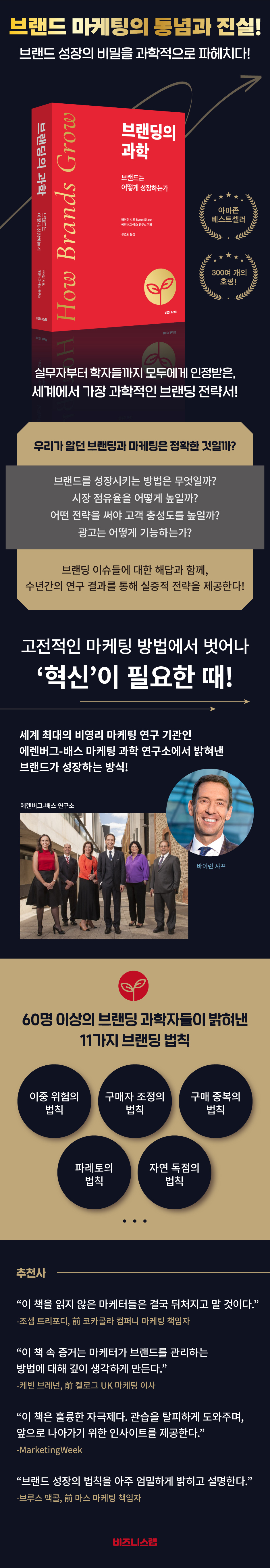 우리는 브랜딩에 대해 얼마나 제대로 알고 있을까? 오래전부터 전해져 온 마케팅 이론이 여전히 유효할까? 이 책은 브랜드 마케팅에 관한 통념을 과학적으로 깨트리며 검증된 전략을 제안한다. 세계 최대의 비영리 마케팅 연구 기관 에렌버그-배스 마케팅 과학 연구소 소장인 저자 바이런 샤프 교수는 60명 이상의 마케팅 사이언티스트들과 함께 “과학적 브랜딩”을 개척했다. 그는 전통적 마케팅 이론의 약점들을 예리하게 짚어내며, 마케팅에 종사한다면 반드시 고민하게 되는 브랜딩 관련 11가지 주제에 대한 명쾌한 해답을 내린다. 고객층을 확장하는 방법부터 광고의 작동 방식, 가격 프로모션의 역할, 로열티 프로그램의 실효성 등 브랜드 성장을 위한 과학적 방법들을 총체적으로 다룬다. 책에서 다루는 여러 법칙은 모든 제품, 서비스, 비즈니스에 두루 적용된다.