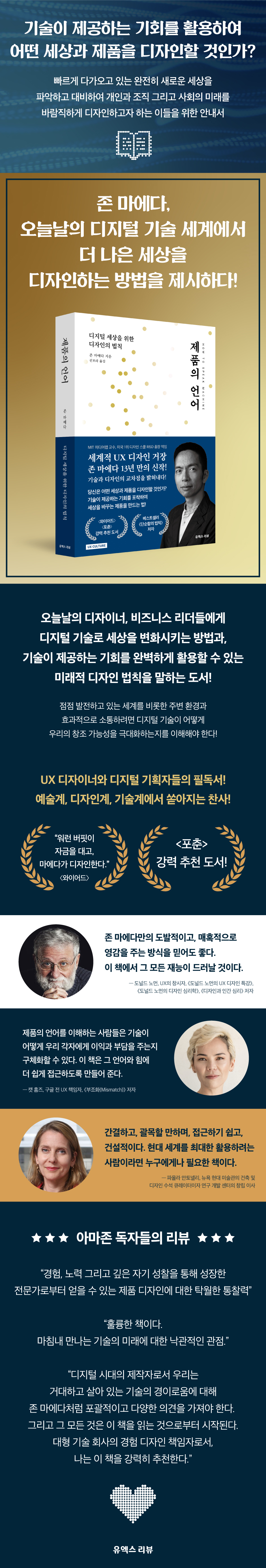 미국 1위 디자인 대학 로드아일랜드 디자인스쿨 총장과 MIT 미디어랩 교수를 역임한 세계적 UX 디자이너로 학계와 비즈니스를 두루 경험해온 존 마에다가 기술, 예술, 디자인의 교차점에서 시대를 앞서는 방향을 제시한다.