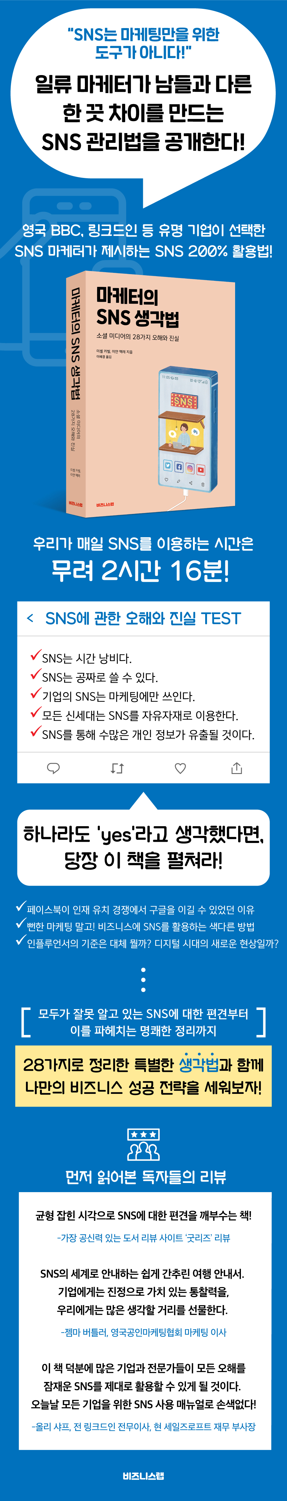 “이 책 없이는 SNS 하지 마세요!” 마이크로소프트가 인정한 ‘최고의 B2B 마케터’ 100인 중 한 명으로 최고 수준의 마케터인 ‘미셸 카빌’이 알려 주는 신개념 SNS 생각법! 통념을 깨부수며 비즈니스에 가장 효과적인 SNS 활용법을 알려 주는 책! 시시한 음식 사진도 마케팅 전략이 될 수 있다면? 회사 계정으로 컴플레인 거는 고객을 단골로 만들려면? 회사 SNS로 소비자들의 니즈를 어떻게 파악하는지 궁금하다면? 바로 이 책입니다! SNS로 할 줄 아는 거라곤 오늘 먹은 음식 자랑밖에 없는 당신, SNS를 비즈니스에 제대로 활용하고 싶다면 바로 이 책이다! 수많은 사람이 SNS를 통해 각종 홍보와 정보를 쏟아내고 있는 지금, 스마트한 SNS 활용을 위해서는 남들보다 한발 앞서 나가야만 한다. 이 책은 영국 BBC, 링크드인 등 대형 기업들과 함께 일해온 잘나가는 마케터가 비즈니스 전반에 걸친 SNS의 무한한 활용법을 다각도로 제시하고 있다. 마케팅 위주의 SNS 운영을 통해서는 해결할 수 없었던 문제들이 있다면 이 책을 통해 남들과 다른 ‘한 끗 차이’를 만들어보자!