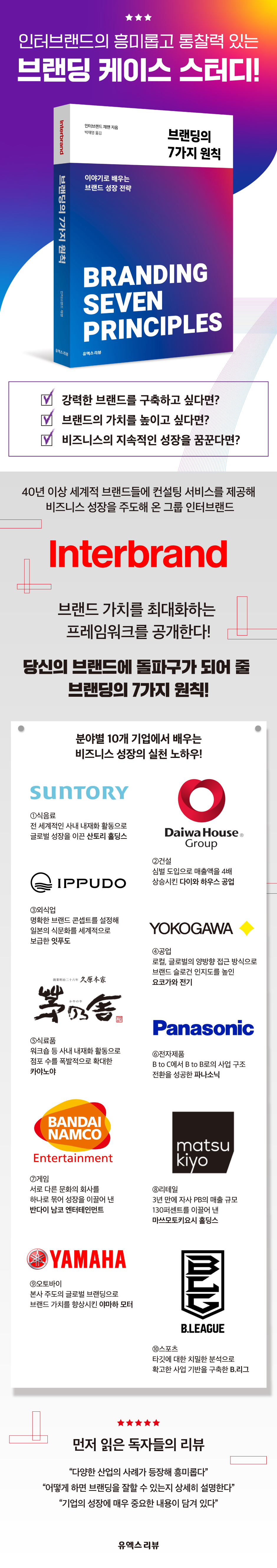 세계 최대의 브랜드 컨설팅 기업 인터브랜드가 분야별로 엄선한 10개의 브랜드에서 비즈니스 성장의 실천 노하우를 배울 수 있는 책. 세상은 급속하게 발전해 가고, 기술 진화와 보급 속도가 비약적으로 빨라져 날이 갈수록 브랜드 경쟁은 가속화되고 있다. 이토록 치열한 경쟁 속에서 비즈니스를 성공으로 이끌기 위해서는 브랜드의 가치를 극대화해야 한다. 이 책을 만든 인터브랜드는 세계에서 한국과 가장 유사한 일본 시장의 기업들을 대상으로 한 컨설팅 경험을 바탕으로 잘 나가는 브랜드에서 발견되는 브랜딩의 7가지 원칙을 정리하였다.