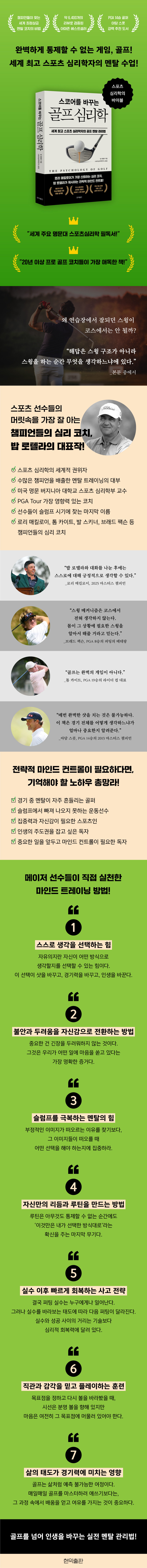 40여 년 동안 메이저 선수들의 심리 코치로 활동한 실전 경험을 바탕으로 불안과 두려움을 다스리고, 실수를 회복하며, 루틴과 직관을 믿고 경기하는 법을 상세히 알려준다. 필드에서 검증된 이 실전 전략들을 따라가다 보면, 경기력을 향상시킬 수 있는 멘탈 관리법을 알게 될 것이다. 저자의 마인드 트레이닝은 단지 경기 중 멘탈 회복에 그치지 않는다. 그는 ‘경기를 대하는 태도’가 곧 ‘삶을 대하는 태도’라고 말한다. 이 책은 골프라는 스포츠를 매개로, 인생을 유연하게 받아들이고 매 순간 최선을 다하는 자세를 알려준다. 중요한 결정을 앞둔 사람, 슬럼프에 빠진 직장인, 자기 확신이 필요한 리더까지. 누구든 자신만의 ‘경기력’을 끌어올릴 수 있다. 더 나은 스코어를 원한다면 반드시 읽어야 할 단 한 권의 책.
